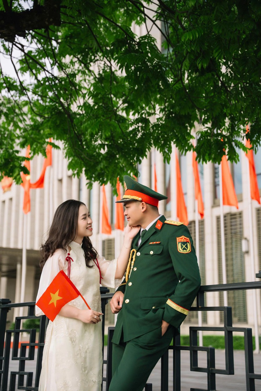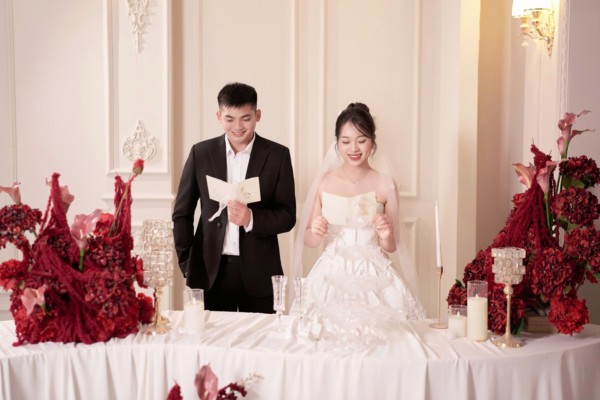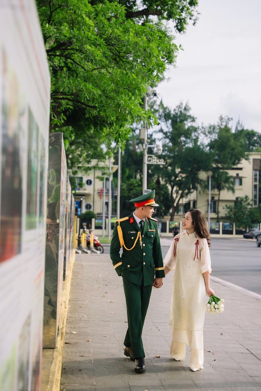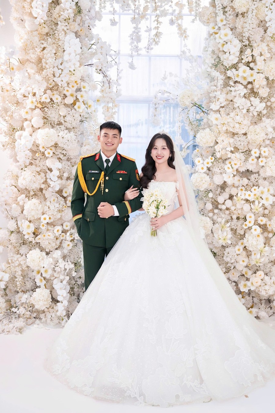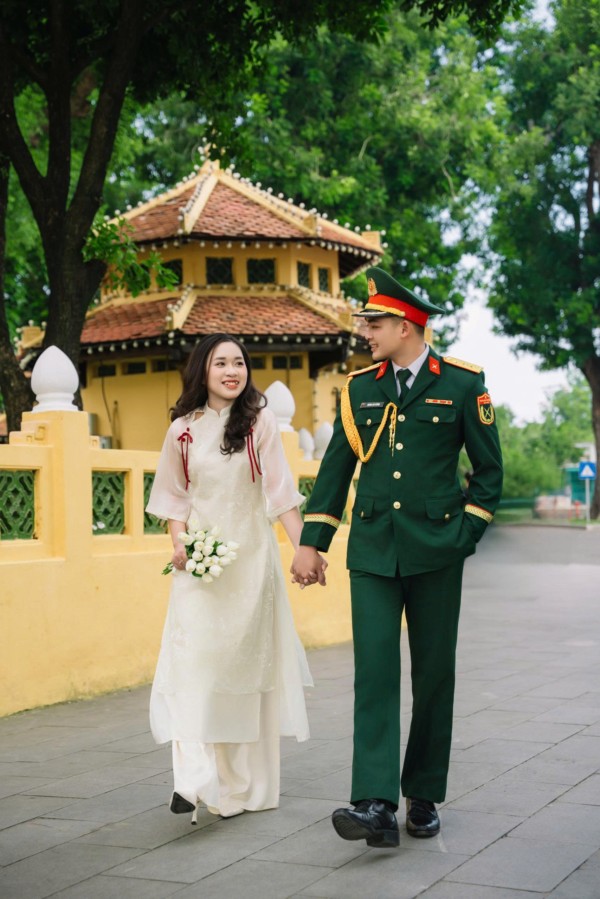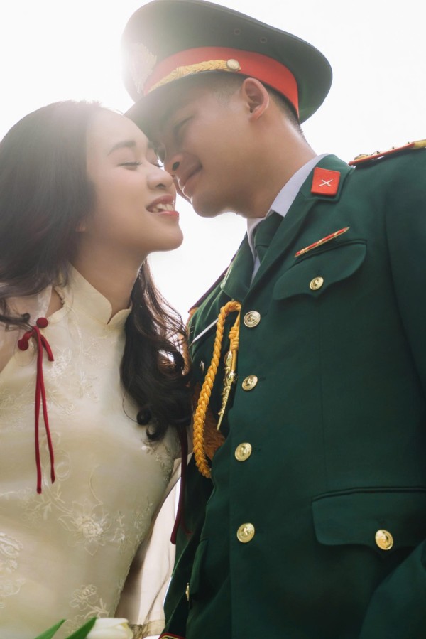 Cô dâu là một hậu phương dịu dàng nhưng vững vàng, luôn lặng lẽ bên cạnh anh qua từng cuộc gọi vội vàng, qua những lần tạm biệt để anh tiếp tục nhiệm vụ. Bằng sự thấu hiểu, nhẹ nhàng và kiên nhẫn, cô là nguồn động viên ấm áp để người lính ấy thêm mạnh mẽ bước tiếp.